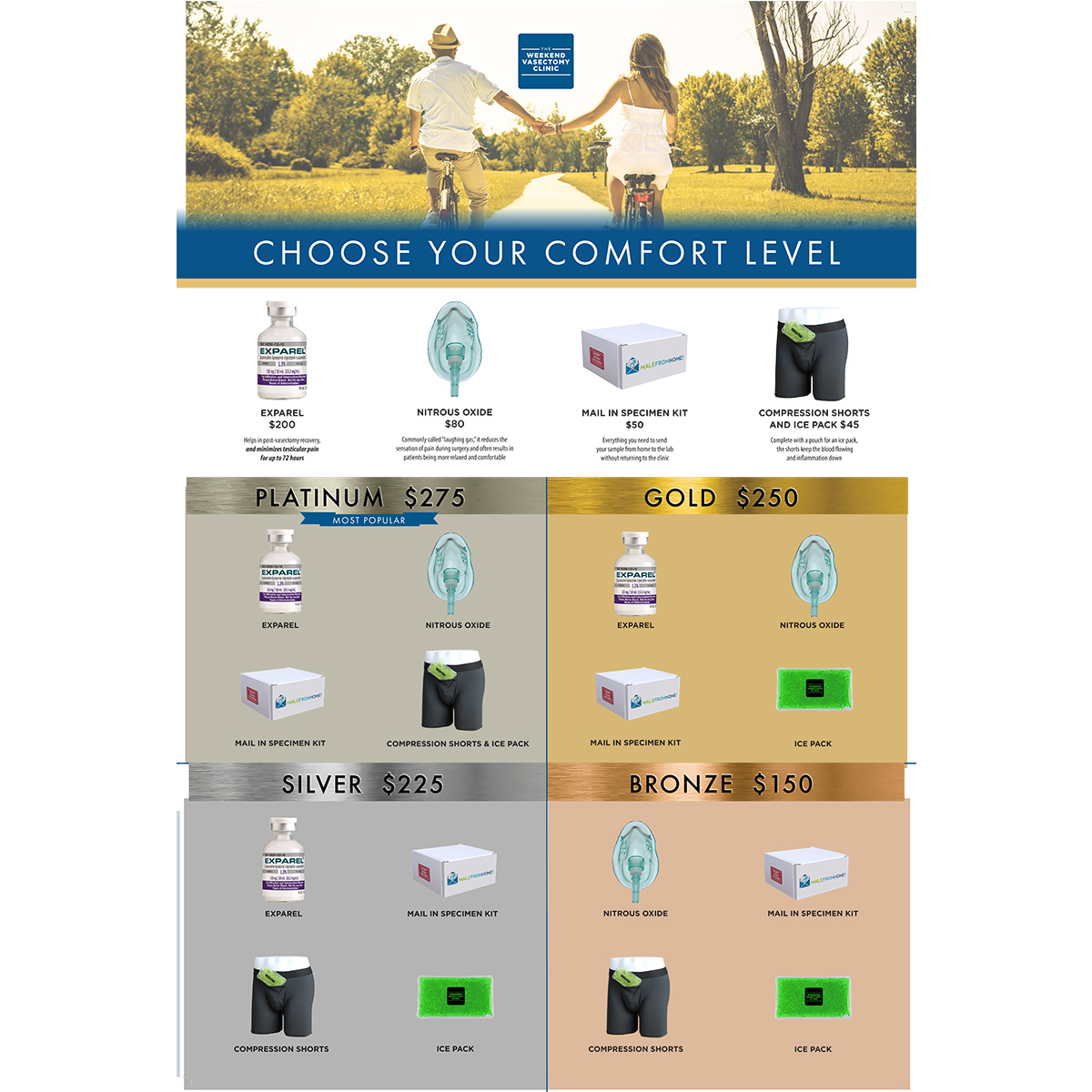 This 24″ x 36″ foam-mounted poster is used to display the various comfort packages available to patients. Ranging from bronze to platinum, the comfort packages provide options to patients to aid in recovery from the vasectomy procedure.